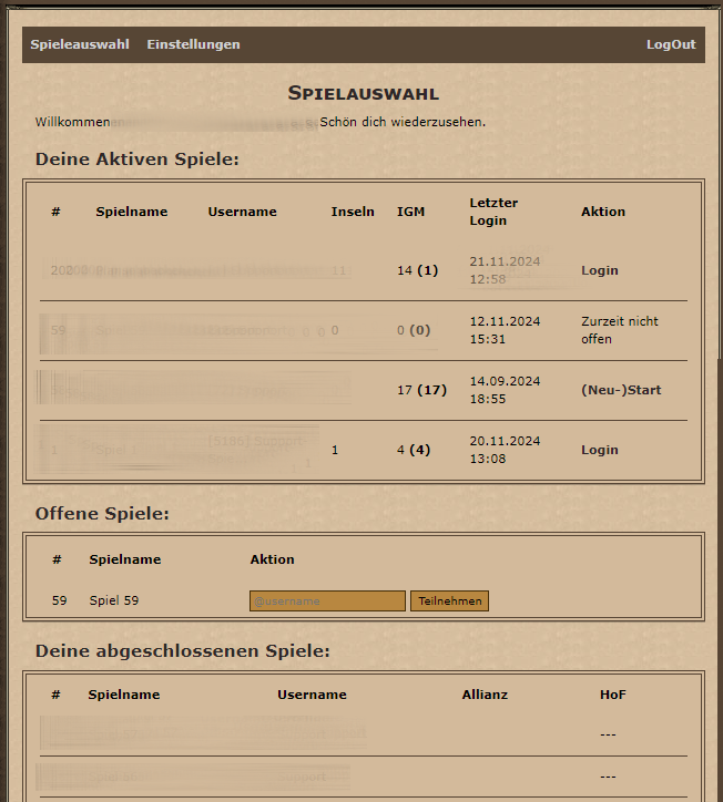 - Nach dem Login sucht man sich nun sein Spiel aus