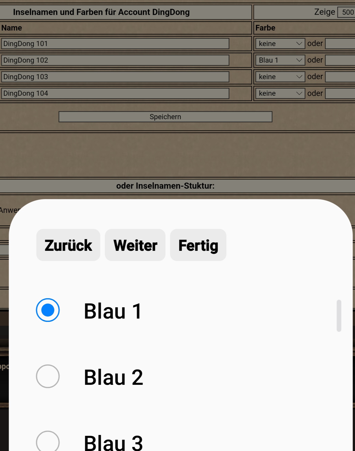 Ich wähle blau1zb. aus für eine Insel.Wenn ich auf speichern gehe kommt die Fehlermeldung.