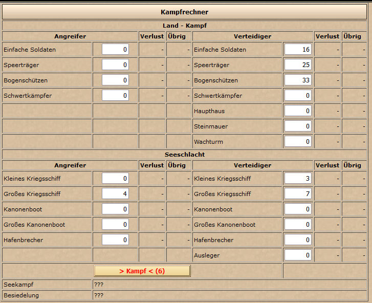 Wenn das HH auf 0 ist, dann ist keine Kampfberechnung möglich. Ausser, wenn ich bei den Speerträgern einen Wert grösser 100 angebe, dann wird eine Berechnung durchgeführt.
